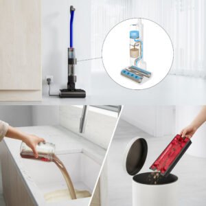 Des brosses secondaires dotées de poils en nylon éliminent les gros débris et les cheveux des rouleaux, tandis que les bords rigides d’extraction expulsent l’eau sale des rouleaux. Les débris sont collectés dans le bac à débris amovible et l’eau sale est pompée vers le réservoir d’eau sale.