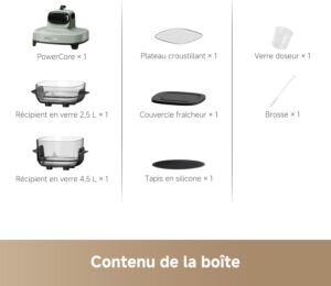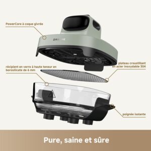 - Non toxique, saine, et sûre] Récipient en verre à haute teneur en borosilicate de 6 mm d’épaisseur associé à un plateau croustillant en acier inoxydable ; Sans revêtement pour une tranquillité d’esprit : aucune odeur étrange ni émission nocive, même lors d’une cuisson à haute température