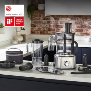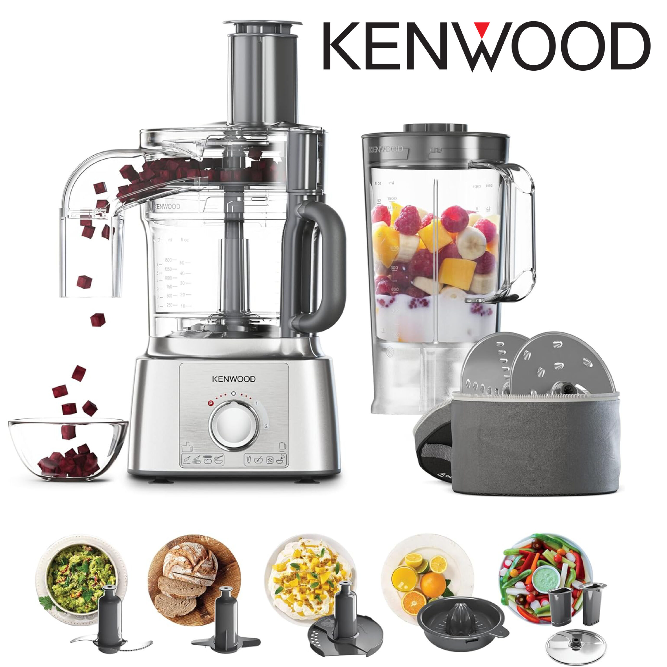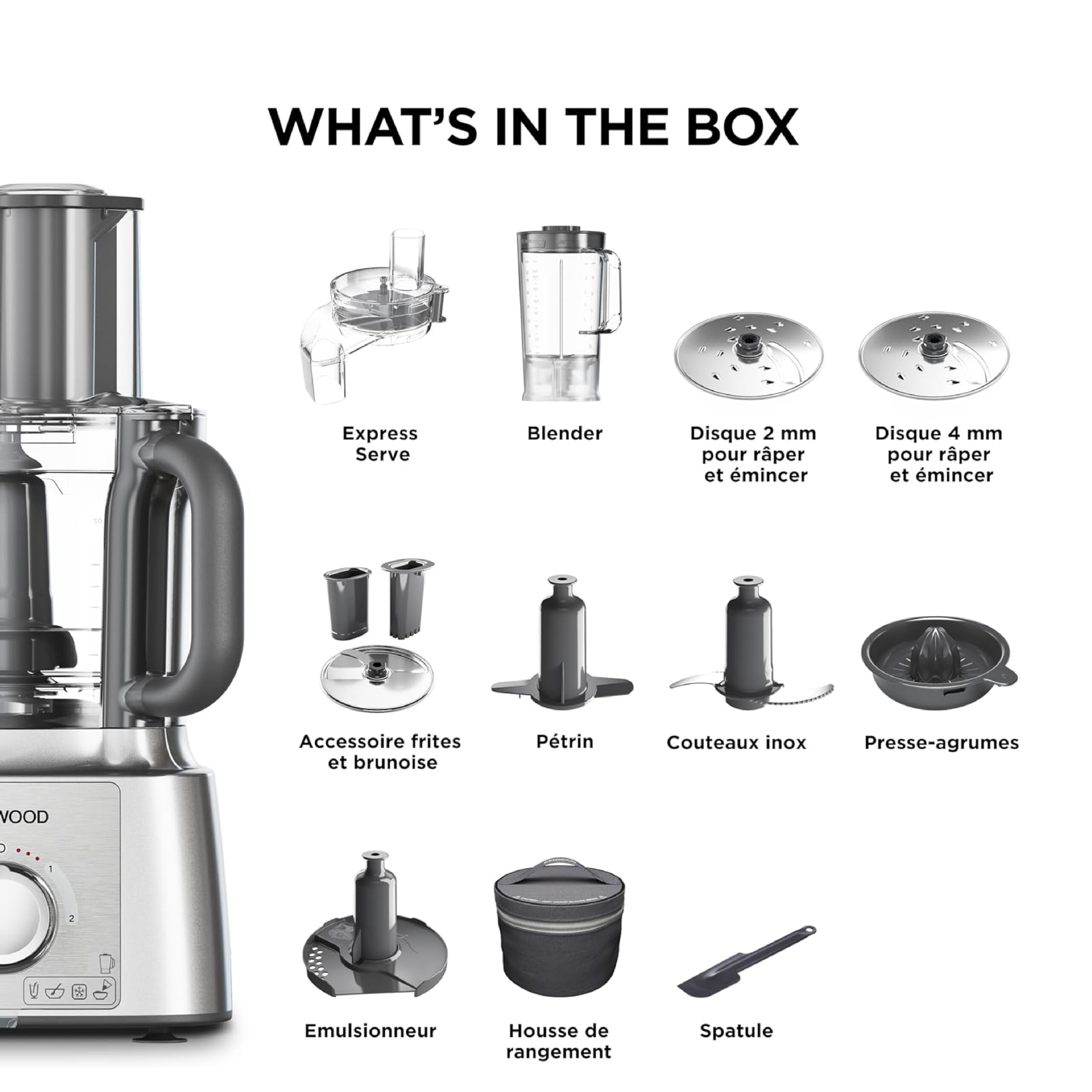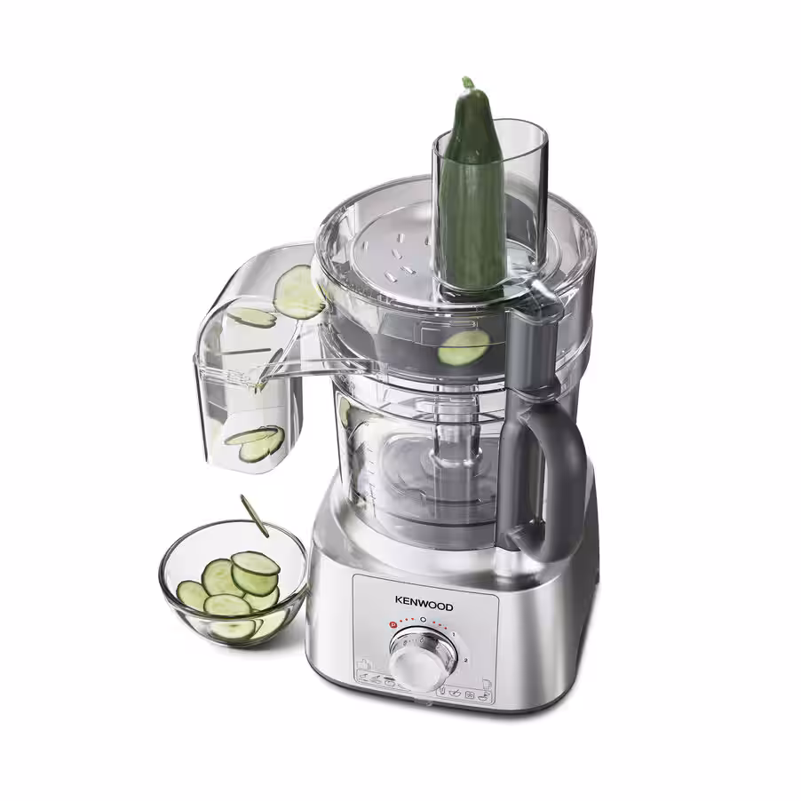 - ÉQUIPEMENT COMPLET : Avec le système original All in One de Kenwood, vous pourrez hacher, râper, trancher, mixer, pétrir, battre et même obtenir des jus frais, le tout avec une seule station de travail.