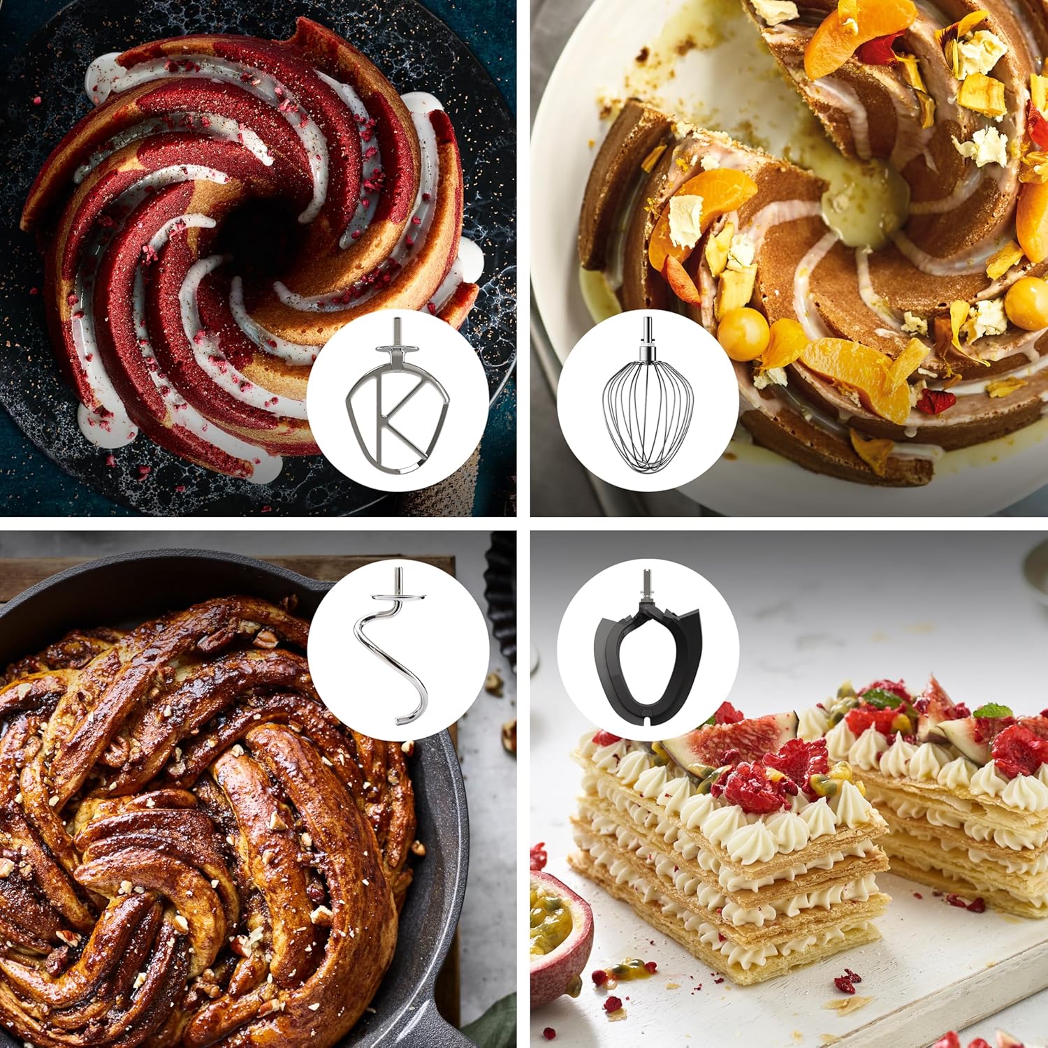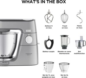 - Outils EasyClean : comprend 4 outils pour le bol : batteur K en acier inoxydable, fouet, outil spiral pour pâte et batteur pour crémage.