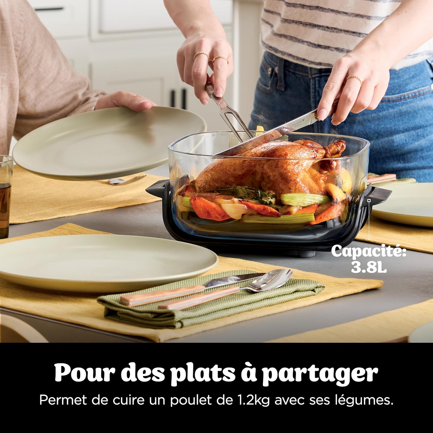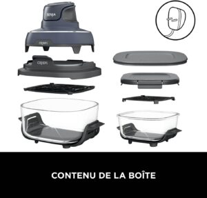 INCLUT : Base moteur 1 700W (prise UE), 2 récipients en verre lavables au lave-vaisselle (1,4L et 3,8L), 2 plaques antiadhésives, 2 couvercles de conservation. H : 34,5cm x L : 30,4cm x P : 34cm. Couleur : Stone/or