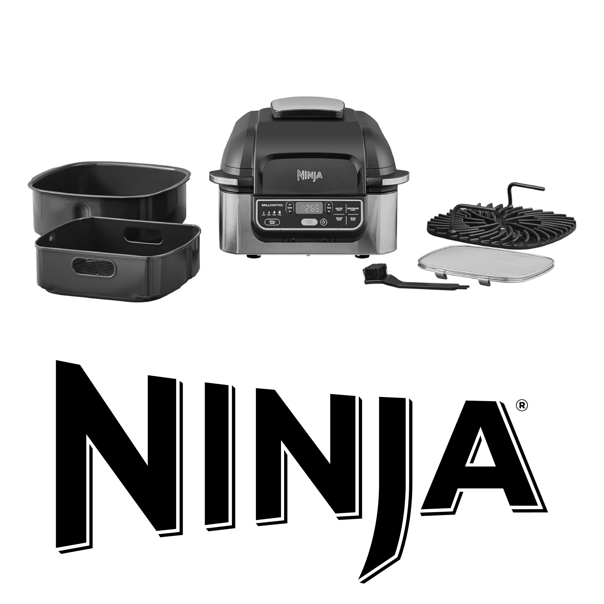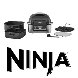 • INCLUS; Ninja Foodi Grill & Air Fryer (prise EU), Pot de cuisson de 5,7 L, Panier de cuisson de 3,8 L, Plaque de Grill, Brosse de Nettoyage, Pièces Lavables au Lave-Vaisselle. Couleur Gris/Argent