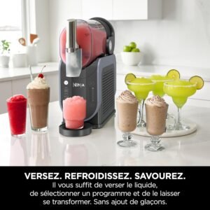 | Caractéristiques | Des boissons glacées à la maison en toute simplicité, Cinq préréglages, Transforme les liquides en granité en seulement 30 minutes* et garde les boissons glacées jusqu’à 12 heures**, Compresseur WhisperChill – maintient silencieusement la température sans gâcher le plaisir. *Créer des boissons peut prendre de 15 à 60 minutes en fonction des ingrédients, du volume et de la température de départ. Doit inclure du sucre. ** Pour les recettes sans produits laitiers |