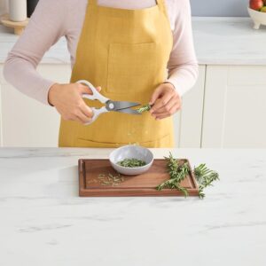 - ENSEMBLE DE 6 COUTEAUX : L’ensemble de couteaux de cuisine en acier inoxydable comprend un couteau de chef, un couteau à pain, un couteau à trancher, un couteau tout usage, un couteau d’office et des ciseaux, ainsi qu’un bloc de couteaux blanc