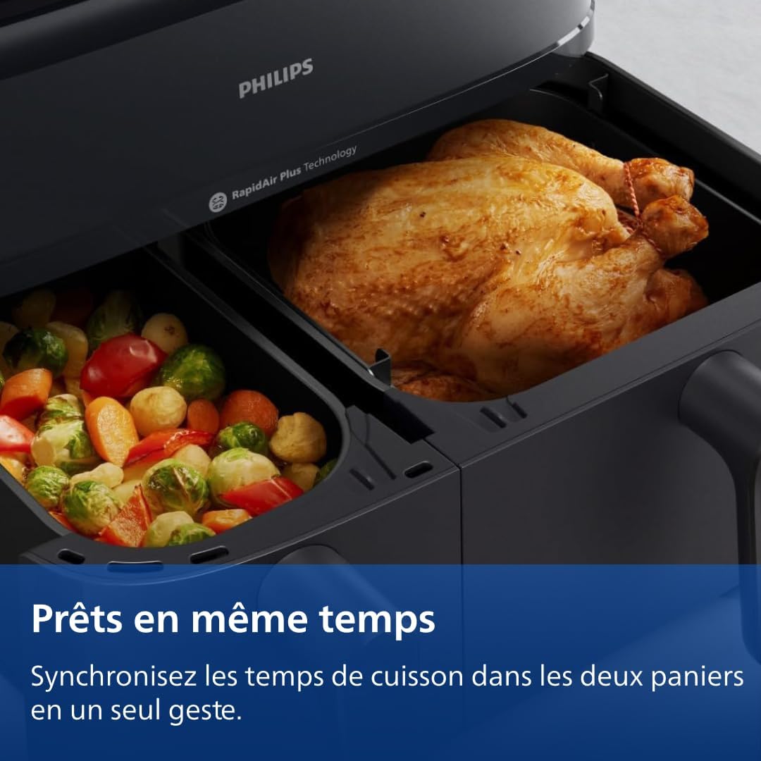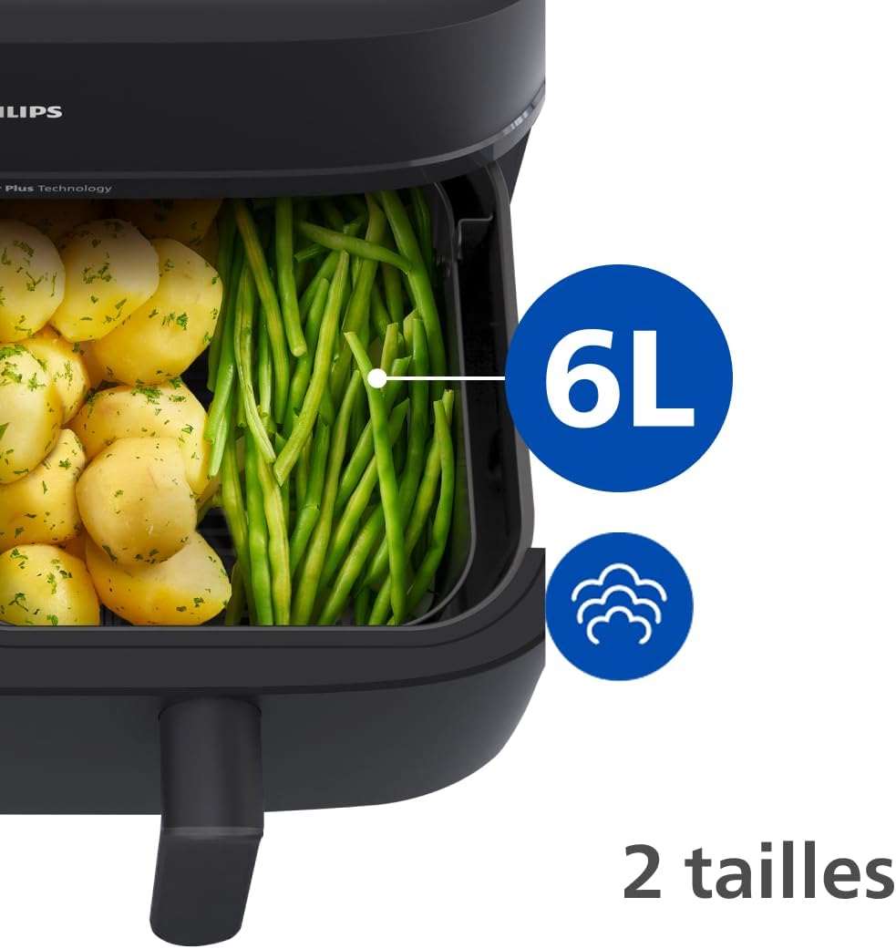 - 2 PANIERS, 2 TAILLES POUR CONVENIR À TOUS LES REPAS : L’airfryer est d’une capacité totale de 9L avec un tiroir de 6L pour les plats principaux, 3L pour les accompagnements. Permet de cuire 1100g de frites, 1600g de légumes ou un poulet de 1,2kg.