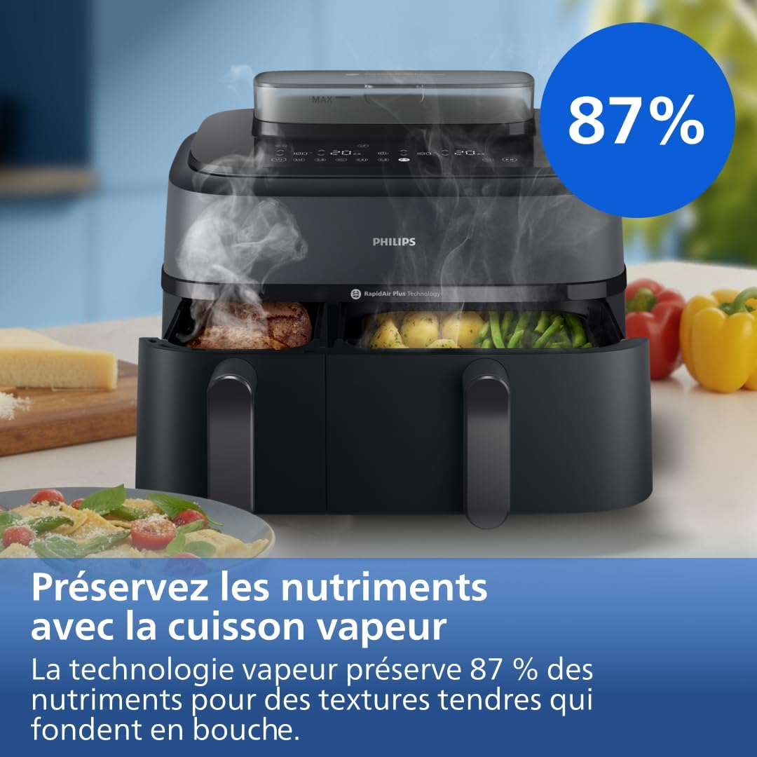 - VAPEUR & NETTOYAGE : La technologie Air Steam garantit des textures tendres, préservant 87% de nutriments en plus que la cuisson à l’eau², tandis que le nettoyage automatique à la vapeur simplifie l’élimination des graisses du panier et du tube chauffant.