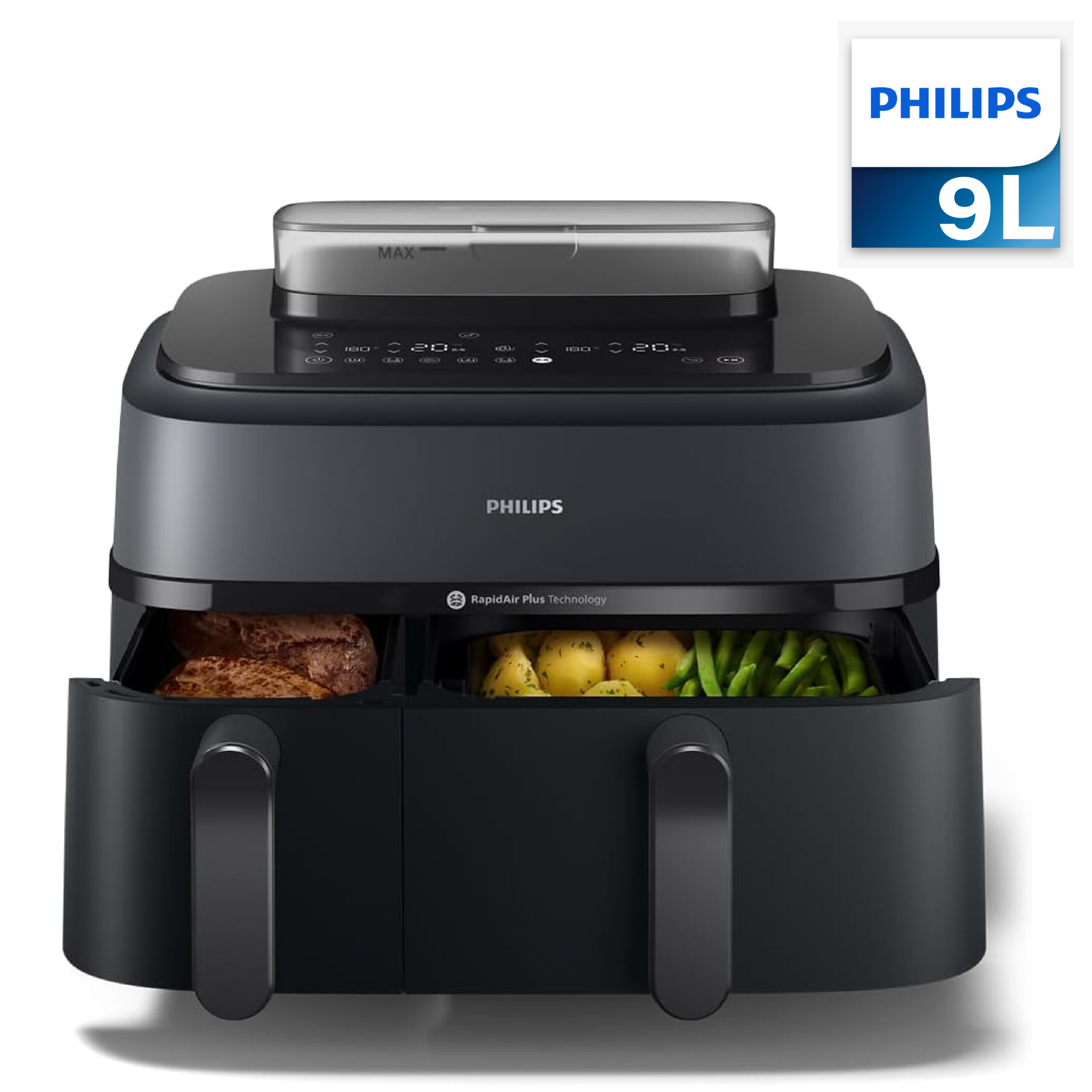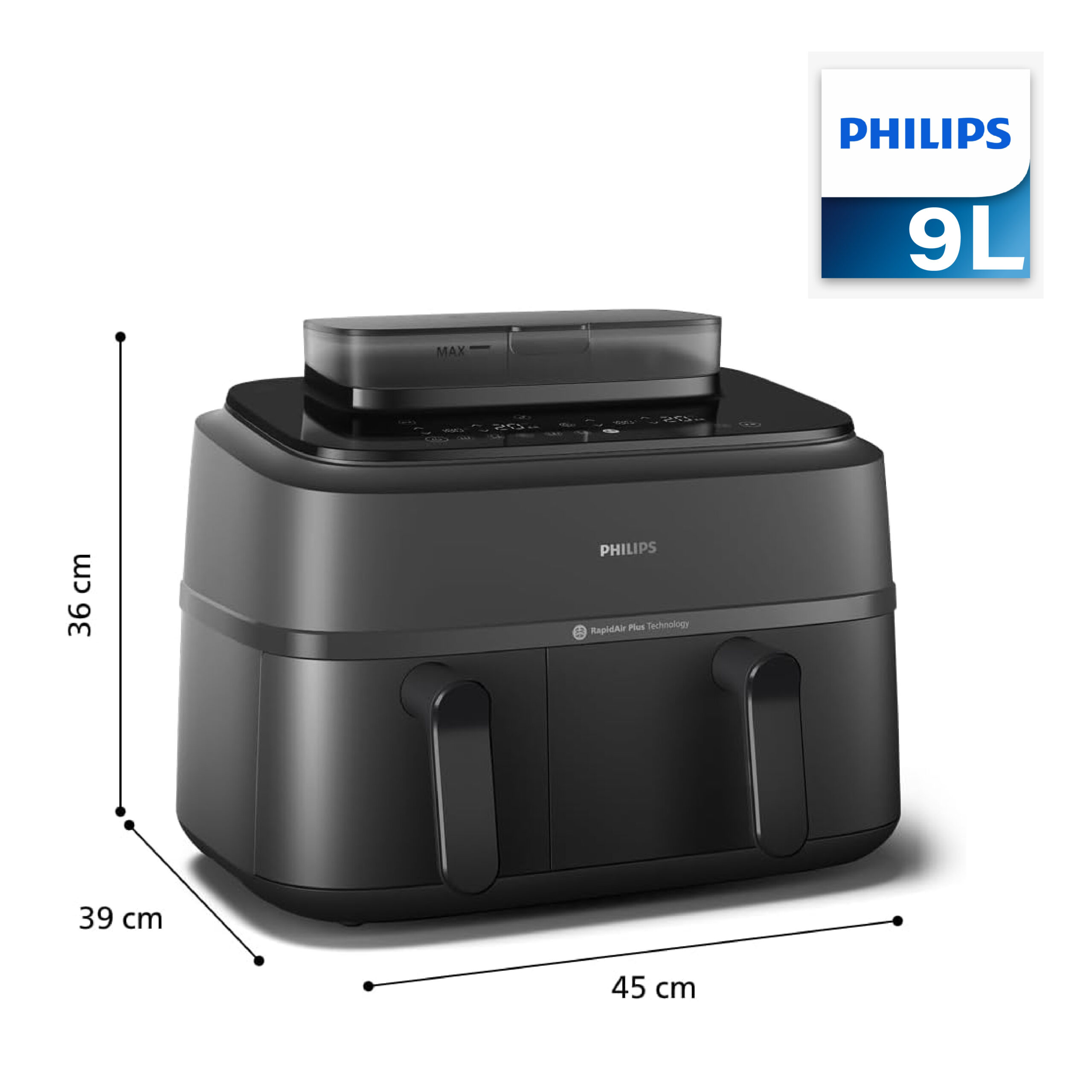 تأتي القلاية الهوائية بسعة إجمالية 9 لتر، مع درج 6 لتر للأطباق الرئيسية و3 لتر للمقبلات. تتيح طهي 1100غ من البطاطس المقلية، 1600غ من الخضروات أو دجاجة بوزن 1.2 كغ.