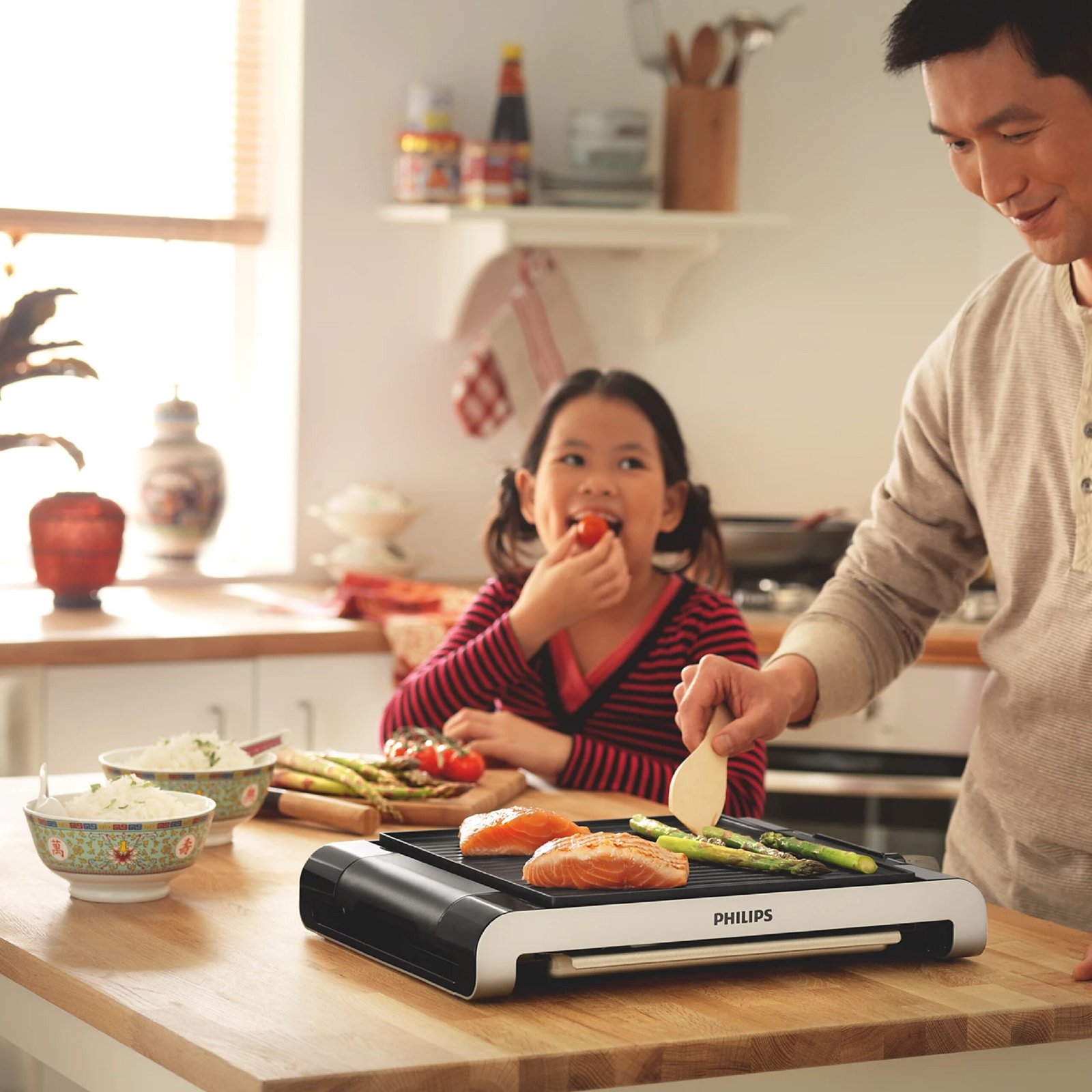 La haute température de la plaque électrique Philips permet de conserver les sucs et les saveurs des aliments. Au moment où il entre en contact avec la surface de cuisson, l’aliment commence à griller et dorer. Il se forme alors autour de celui-ci une enveloppe savoureuse qui préserve le goût originel et les vitamines.
