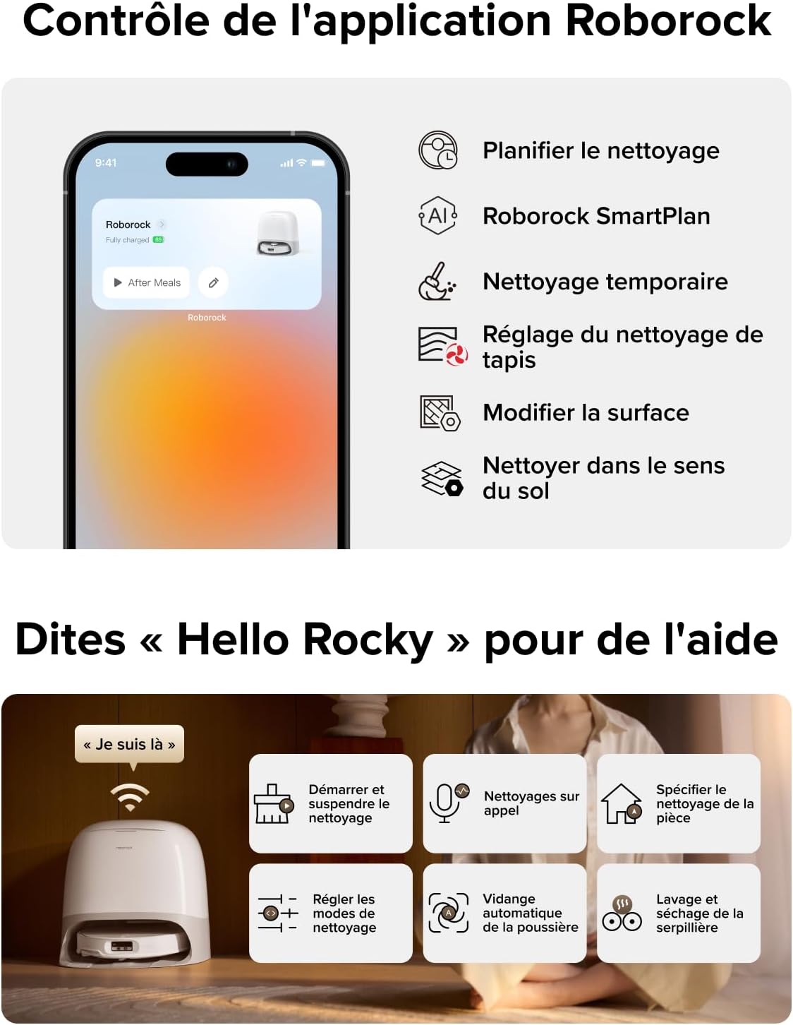 - Méthode de Contrôle Polyvalente: Avec un assistant vocal intelligent intégré, l’robot laveur peut effectuer des tâches de nettoyage simplement en disant « hello rocky ». Outre l’application roborock, vous pouvez également le contrôler par le biais de commandes vocales telles qu’Amazon Alexa, Apple Siri ou Google Home. De plus, le roborock Qrevo CurvX prend également en charge le protocole Matter pour découvrir la commodité de la maison intelligente intégrée