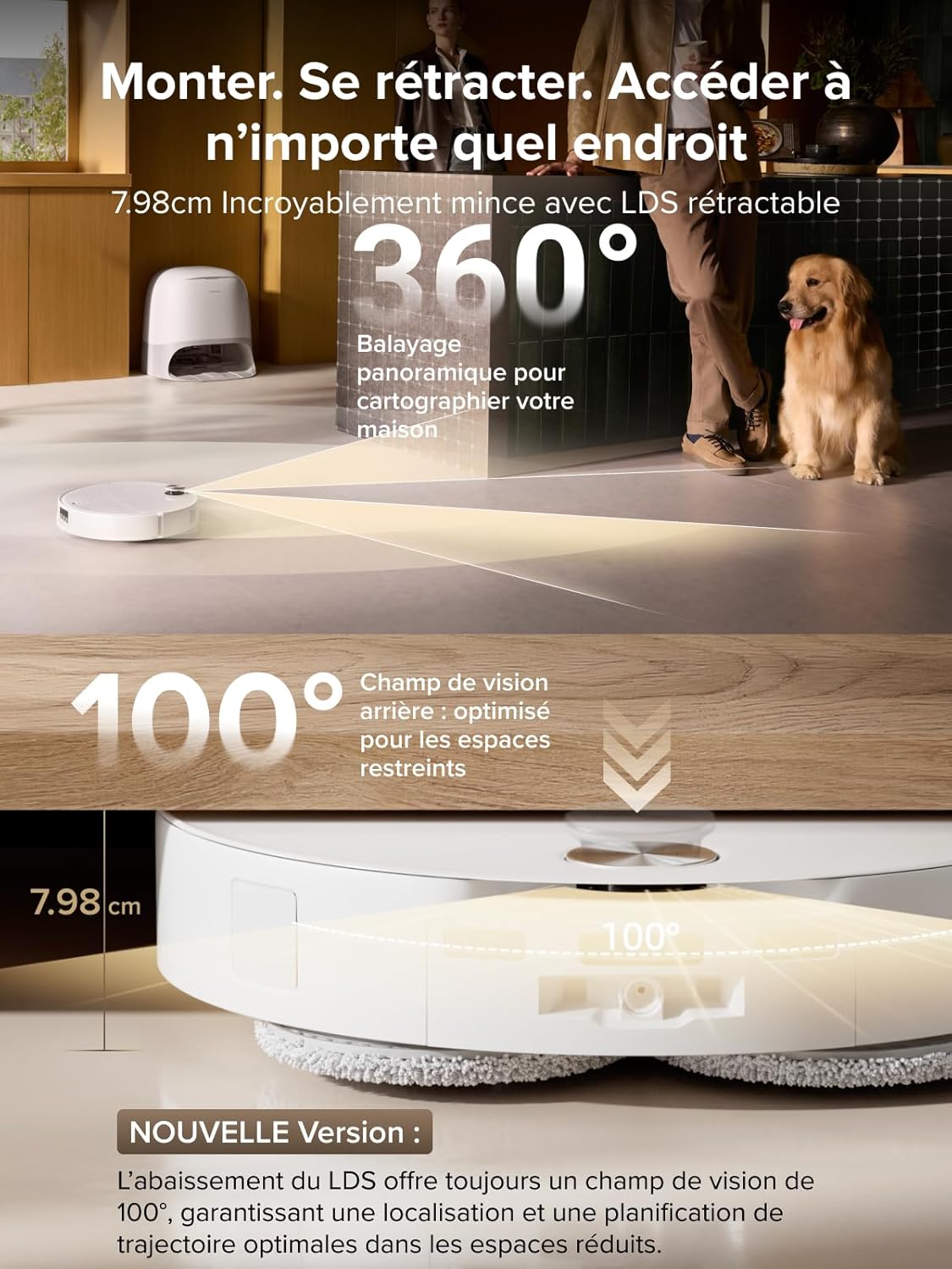 - Naviguer Partout & Ultra-fin de 7,98 cm : Le aspirateur robot laveur est équipé du système de navigation RetractSense, qui offre un balayage panoramique à 360° pour cartographier votre maison avec une précision extrême et tracer l’itinéraire de nettoyage le plus efficace. Le capteur LiDAR rétractable avec son boîtier ultra-fin de 7,98 cm assure une navigation fluide et précise, même dans les zones les plus difficiles d’accès.