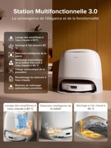- Multifunctional Dock 3.0 Thermo+ : Le aspirateur robot laveur avec station améliorée utilise de l’eau chaude à 80 °C pour dissoudre les taches tenaces et la graisse, et de l’air chaud à 45 °C pour sécher complètement les serpillères et la base de la station. Le système intelligent de détection de saleté surveille en permanence le niveau de saleté afin d’ajuster la durée du lavage et de déclencher un nettoyage supplémentaire.