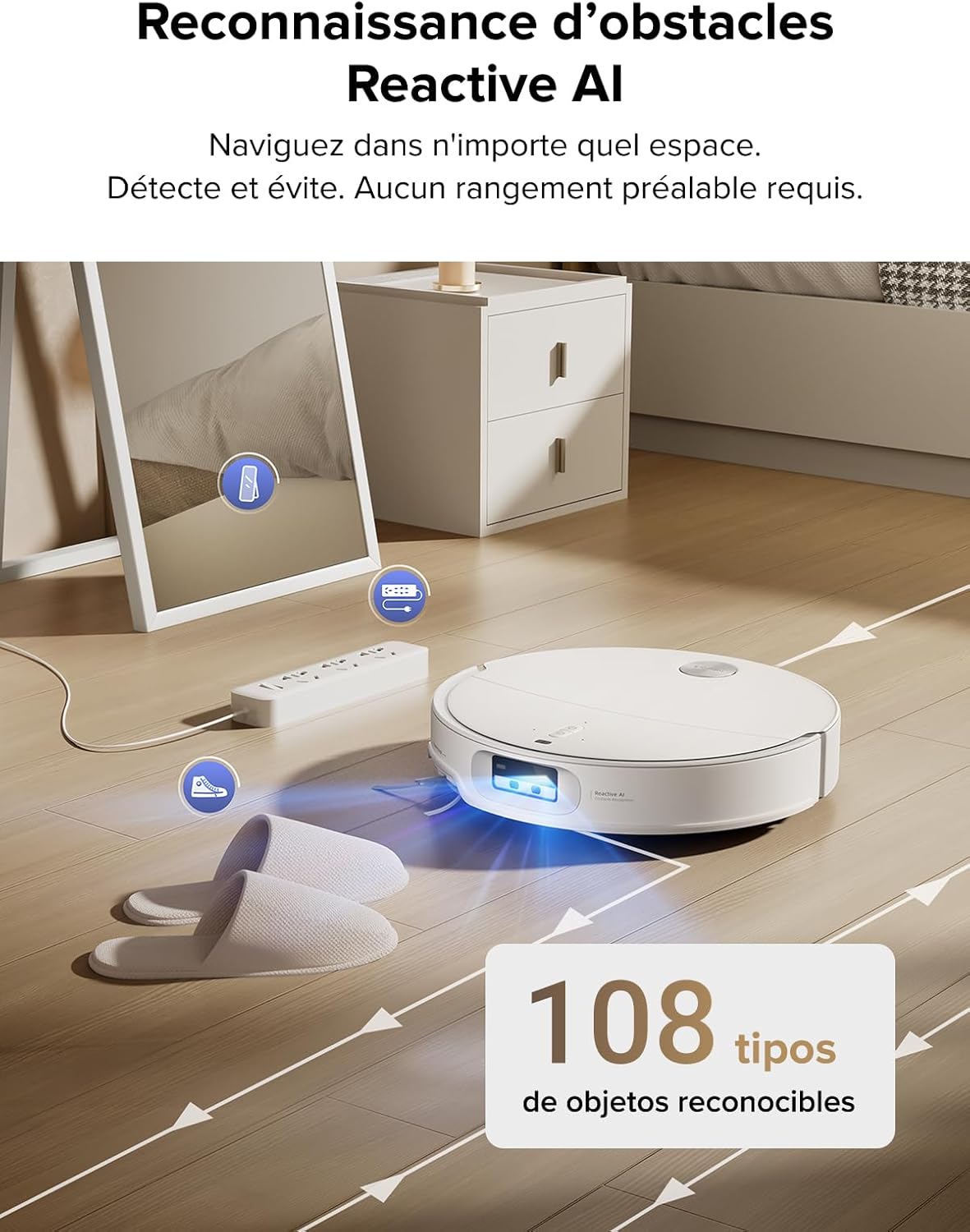 - Reconnaissance d’obstacles Reactive Al : Grâce à une lumière structurée et à une caméra RGB, le aspirateur laveur robot détecte et évite intelligemment 108 types d’objetsto, permettant une navigation fluide autour des obstacles dans les espaces bien éclairés ou sombres – pas besoin de nettoyer le sol à l’avance.