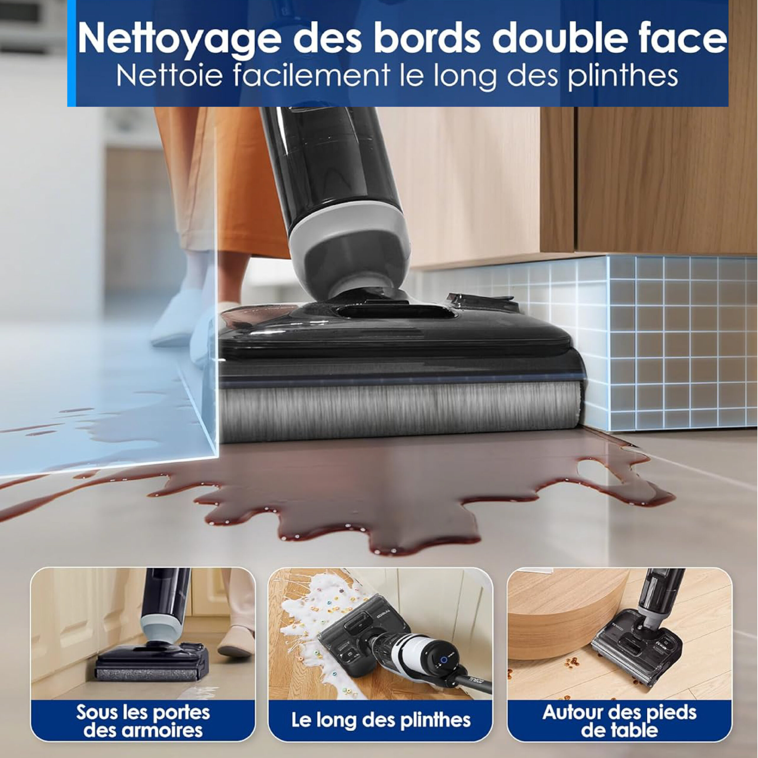 🧹➡️⬅️ Nettoyage des bords des deux côtés : Suit parfaitement les plinthes, atteint les bords gauche/droite et ne laisse aucun coin oublié.